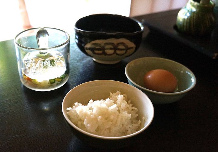 富山市のたまご園「田村農園」のうみたて卵を抹茶茶碗で溶いて卵かけご飯にするほか、ガラス製の専用容器に入った新鮮野菜の浅漬けなどご飯のお供が用意されているので、ご飯が何杯もすすみます。