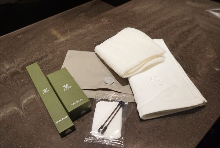 手拭いやボディタオル、歯ブラシなどは、布製のアメニティポーチに入っています。シンプルでボタンのデザインがかわいいアメニティポーチはお持ち帰りOKです。