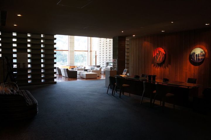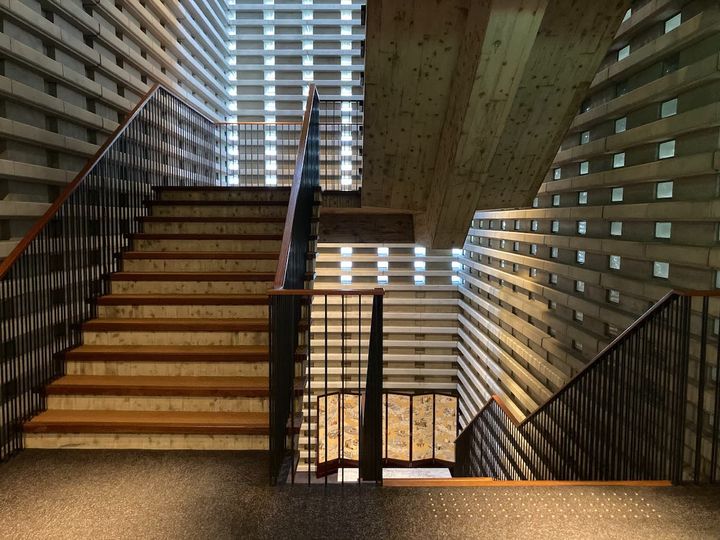 そしてロビーのこの美しさに思わず声が漏れます。あらかじめ形成されたプレキャスコンクリートを校倉に組んだ壁が印象的な大空間に、天井までの大きな窓で切り取られた神通峡の景色がまぶしく目に飛び込んできます。