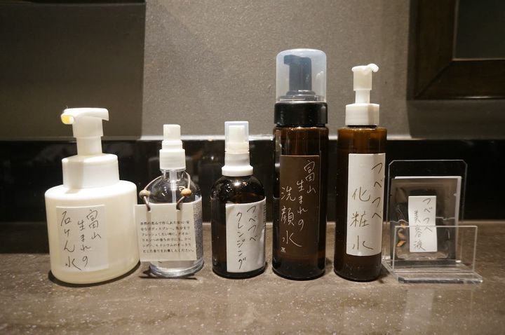 客室や大浴場などに用意されている基礎化粧品は、メイドイン富山の雅樂倶オリジナル。名称に用いられている「つべつべ」は富山の方言で「すべすべ」のことで、ネーミングもかわいいです。