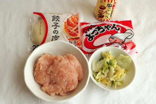 餃子の餡は、豚ひき肉、にんにく、しょうがを使うのが一般的。けれど今回は、塩・こしょうを振った鶏ひき肉を使い、香味野菜やしょうゆなどの下味を付けずに作りました。