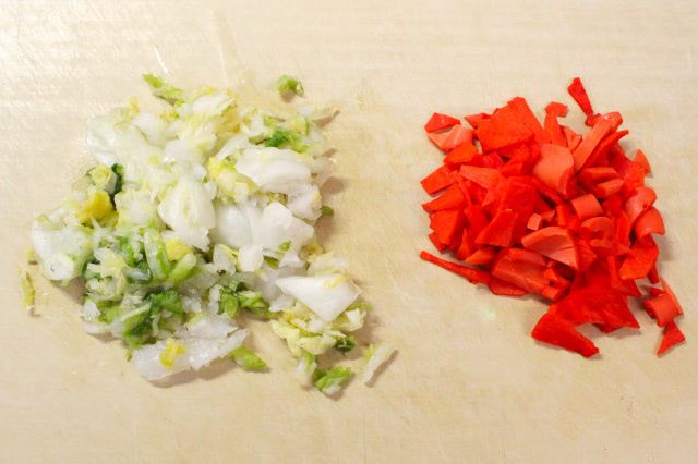 餃子に白菜の漬け物を入れるのが、丸山さん流です。レシピに、「よっちゃんイカを切る」とは書かれていませんでしたが、そのまま使うと混ざりにくそうだったため、粗みじん切りにしました。