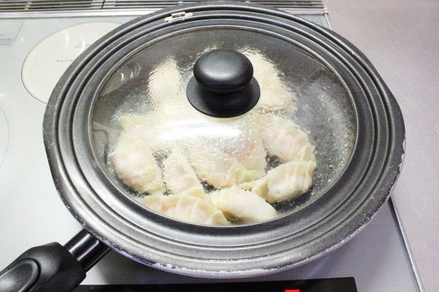 レシピに詳しい餃子の焼き方が書かれていないため、一般的な焼き方で焼いてみます。中火で4分ほど焼くと、底面に焼き色が付きました。