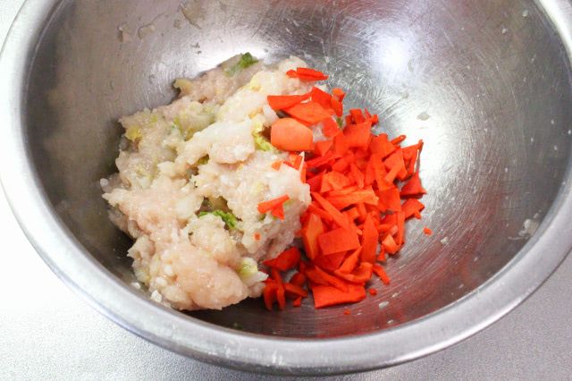 鶏ひき肉、白菜の漬け物、塩・こしょうを先によく練ってから、よっちゃんイカを加えて混ぜました。鮮やかな赤色が、紅しょうがを思わせます。