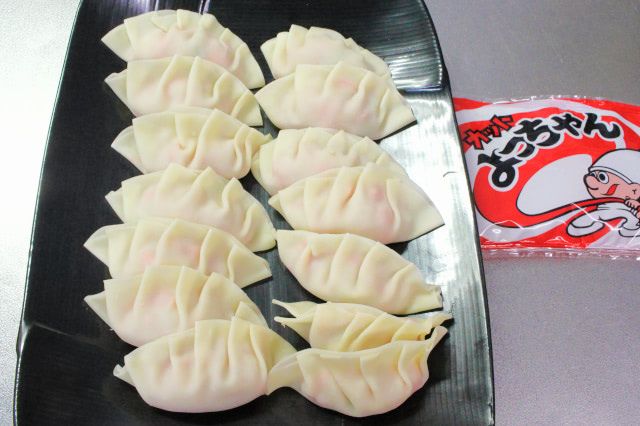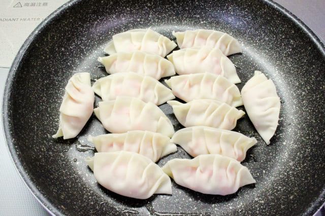 4. フライパンにサラダ油を引き、中火で熱して、餃子を焼きます。