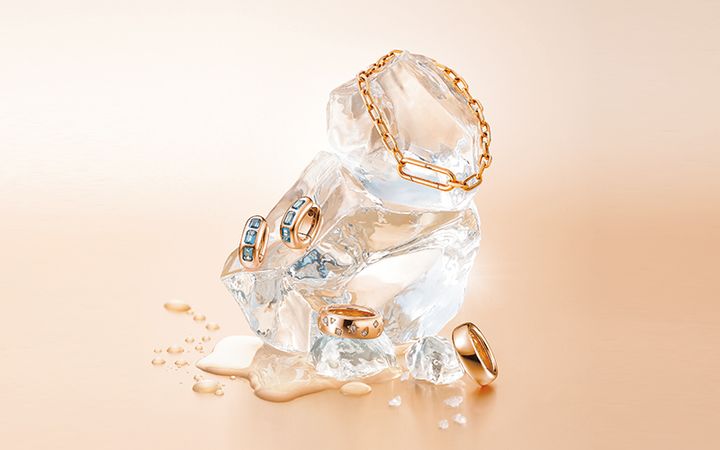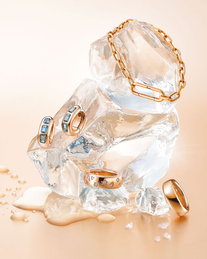 シンプルなゴールドリングのほか、ダイヤモンドを星形など様々な形のゴールドに埋め込んだ遊び心あふれるデザイン、ポメラートお得意のカラーストーン、そしてなめらかなチェーンが美しいブレスレットまで…「イコニカ」の世界は自由。レスポンシブルゴールドの調達を100%実現しているというのも、ゴールドスミスとしての責任を果たすポメラートの大切な約束。「イコニカ」リング〈RG〉¥308,000〈RG×D〉¥770,000ブレスレット〈RG〉¥495,000ピアス〈RG×ロンドンブルートパーズ〉¥1,100,000(すべてポメラート)