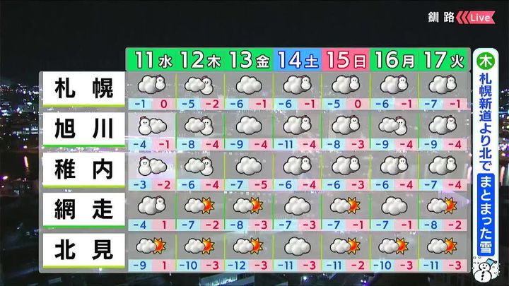 12日(木)は稚内や岩見沢周辺で雪が強まり、札幌市内でも北区や東区、白石、厚別など札幌新道より北の地域で10センチ以上の雪が降りそうです。寒さも厳しく、12日(木)から各地で真冬日になるでしょう。