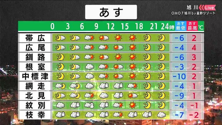 道東は晴れますが、風が強まります。オホーツク海側は昼頃にかけて広く雪が降ります。枝幸では朝も日中も軽い雪かきが必要になりそうです。