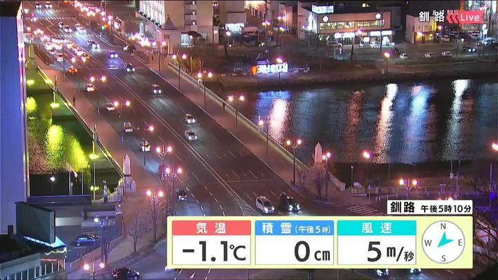 10日午後5時20分頃の釧路の様子です。ライトアップされた幣舞橋の下を流れる釧路川は穏やかですね。