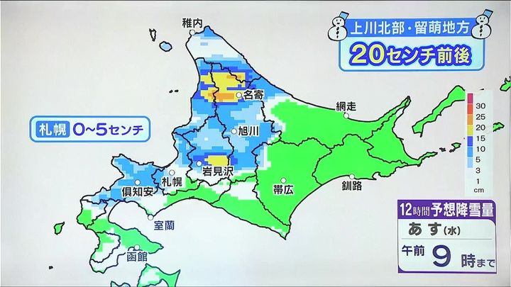 広く雪の降る時間があるでしょう。日中は雷を伴って降り方の強まるおそれもあります。あすの日中も道北や空知、後志地方でさらに10~20センチの雪が降りそうです。最高気温は1度前後で寒さも続きます。