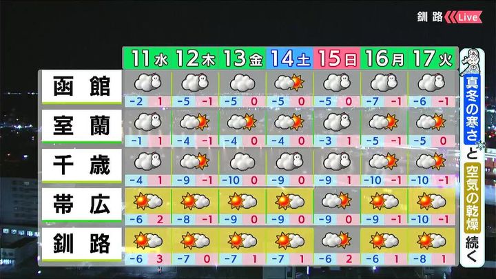函館は雪が降っても量は少ないでしょう。その他は東部を中心に晴れて空気が乾燥します。真冬の寒さも続きます。暖房器具など火の取り扱いに注意して下さい。