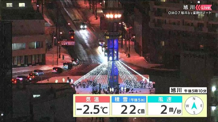 10日午後5時20分頃の旭川の様子です。イルミネーションがキレイですが、路面はツルツルなので、見とれすぎないように慎重な運転を心がけましょう。