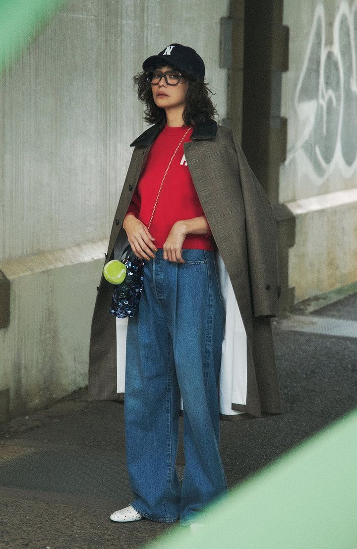 コート¥275,000(バウト/ボウト)、スエット¥15,950(アダム エ ロペ)、デニムパンツ¥46,200(ハイク/ボウルズ)、キャップ¥7,480(マスターアンドコー/ヴェルメイユ パー イエナ 青山店)、バッグ¥170,500(アニヤ・ハインドマーチ フォー ユナイテッドアローズ)、バッグチャーム¥5,500(ユナイテッドアローズ/共にユナイテッドアローズ 六本木ヒルズ店)、メガネ¥57,000(ボッテガ・ヴェネタ/ケリング アイウエア ジャパン カスタマーサービス)、シューズ¥174,900(ローレンスディケイド別注/スーパー エー マーケット 青山)