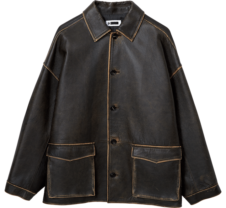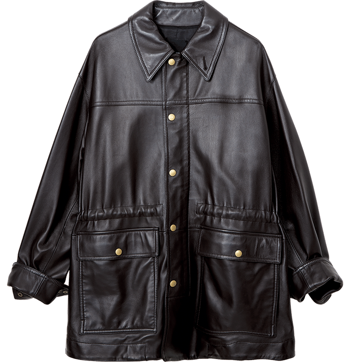 ブラックに近いこげ茶のシンプルなレザーコート。レザーの強さがあまりなく、上品なので、ミューズ世代にもトライしやすいはず。オーバーサイズで、メンズと共用するのもオススメ。