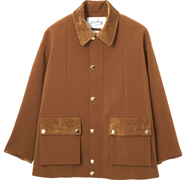 深みのあるチョコレートブラウンがおしゃれ心をかき立てます。やや細身のオーバーシルエットながら、首まわりはフィットするのでクラシカルなムードにまとまります。