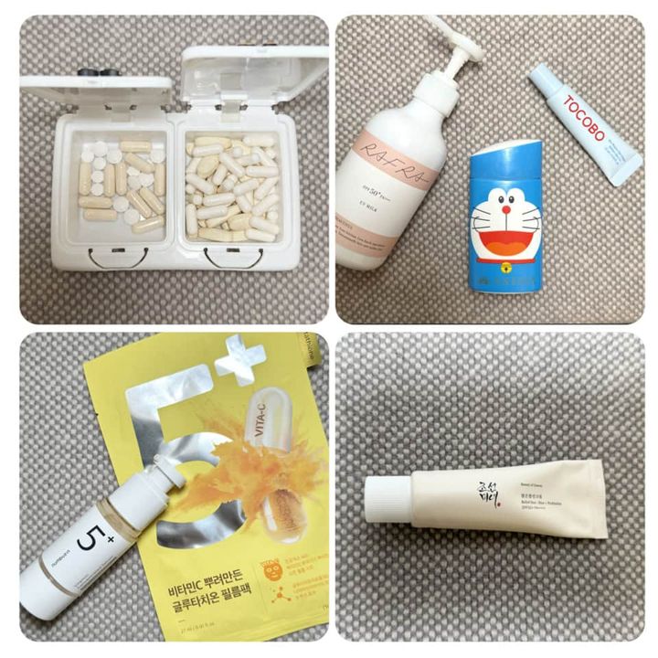 ガッツリ施術してから5年くらい経ちましたが、肝斑だけはまだ気になるのでトラネキサム酸を常飲しているのと、思い出したときにL-システイン、ビオチン、ビタミンCのセットを飲んだりしています。日傘は今年ようやくデビューしたばかりですが、日焼け止めは1年中欠かさず塗ります。ロケやアウトドアのときは金シャカでおなじみのアネッサ パーフェクトUV スキンケアミルク、デイリーの首から上はBeauty of Joseonの米サンクリーム、体にはポンプ式のラフラのUVミルクを使っています。持ち歩きにはTOCOBOのバイオウォータリー日焼け止めのミニサイズを常備。日焼け止めは本当にいろいろ試してきましたが、今の1位は圧倒的に米サンクリームです。革命としか言いようがない。普段は美白系のスキンケアは使っていないんですが、特に紫外線を浴びたな〜という日は、普段のケアにナンバーズインのセラムとパックを追加しています。