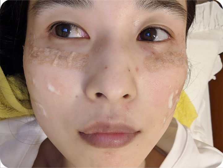 Qスイッチレーザーで個別のシミを照射。3Mのポアサージカルテープ(肌の保護テープ)はちょっとした傷に便利なので今でもことあるごとに愛用しています。おすすめ。紫外線が大敵なので夏にやらないほうがいいです。