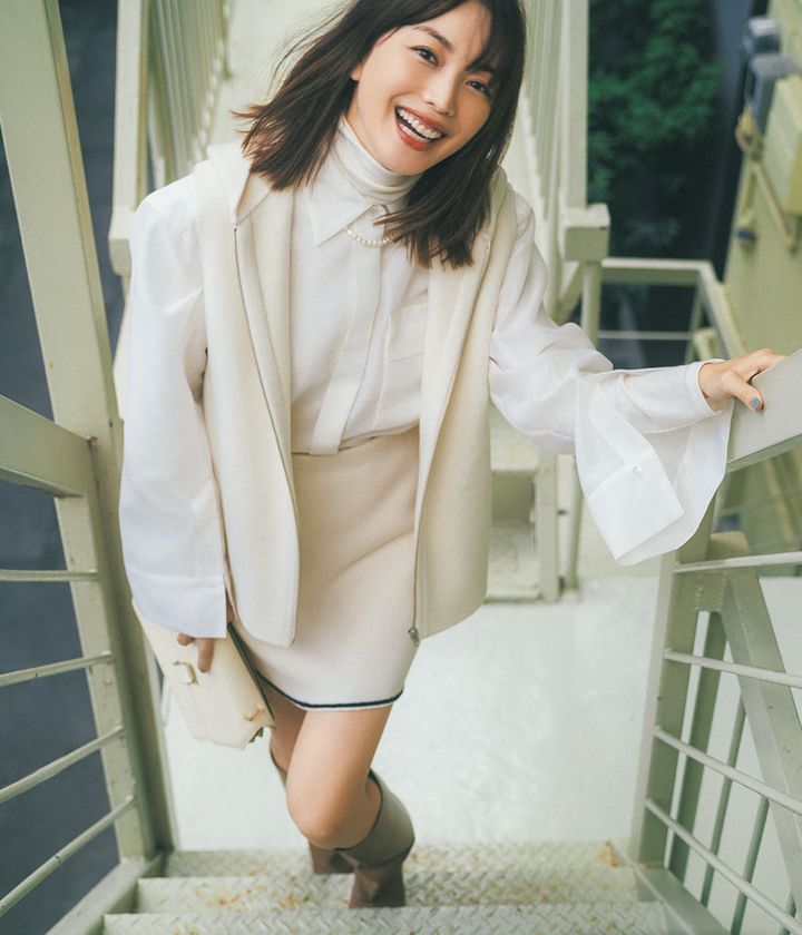 スカート¥39,600ジップアップジレ¥59,400ニット¥20,900(すべてTheory)シャツ¥46,200(コラム/エストネーション)ネックレス¥17,600(ココシュニック オンキッチュ/ココシュニック)バッグ¥555,500(ヴァレクストラ/ヴァレクストラ ジャパン)ブーツ¥105,600(ネブローニ)