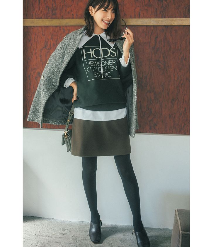カジュアル感を存分に楽しめるカーキにロゴスウェットの合わせは若いコと一線を画すジャケットや小物で格上に。万能なチャコールグレーのタイツでブーツとつないで。