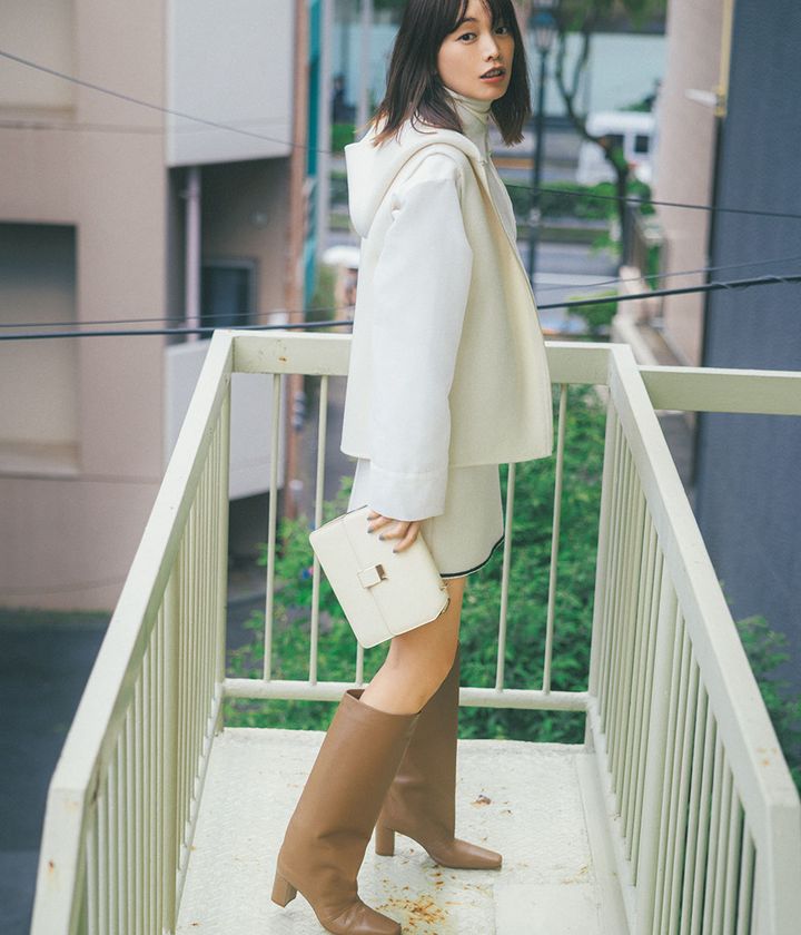 白のミニスカコーデはキレイめにまとめすぎると張り切った印象になるので、カジュアルやマニッシュを足すと大人でもうまくいきます。素材の違う白のミックスで立体感を出して。ブーツはどんな色も上品に受け止めるエクリュベージュで。
