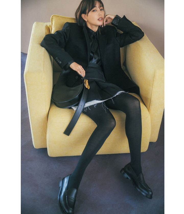 チャレンジアイテムだからまずは入りやすい黒からスタート。馴染みのある大人ブランドから選ぶと安心感もあって照れずに着られます。デザインの効いたミニスカで洒落感もUP!気恥ずかしさはジャケットやレザーシャツでハンサムを足して払拭。全身黒のモード感で洗練されたミニスカルックが完成。ローファー合わせは黒タイツでつなげるのが正解。