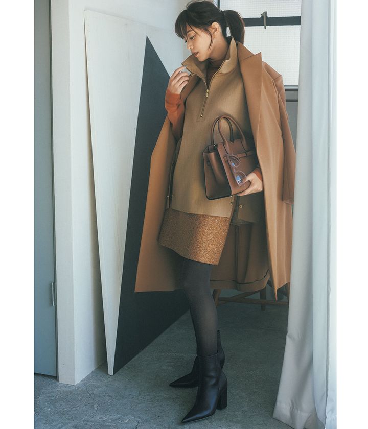 ベージュより華やか見えする赤みを帯びたキャメルが都会的な印象に。ミニスカのツイード素材やシアーインナーでエレガントな要素を入れてより大人の魅力を発揮。