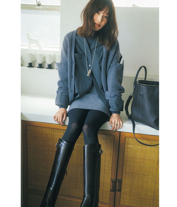 スカート¥39,600(エストネーション)カーディガン¥59,400(テラ/ティースクエア プレスルーム)シャツ¥19,800(ザ ポーズ/ウィム ガゼット 青山店)タートルニット¥9,900(FRAY I.D/FRAY I.D ルミネ新宿2店)ネックレス¥112,200リング¥30,800(ともにプラウ)バッグ¥457,600ブーツ¥289,300(ともにトッズ/トッズ・ジャパン)タイツ¥9,240(フォーガル/エンメ)