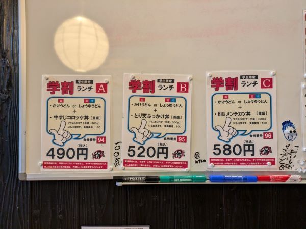 「出汁は厳選された材料をバランスよく配合し、火加減に注意を払いながら、じっくり弱火で2時間以上の時間をかけて旨みを抽出し、毎日でも食べられる飽きの来ない出汁作りを心掛けています。麺用粉は、ソフトで粘りが出るもの、なめらかでコシが出るもの、もちもちとした食感が出るものの3種類を独自にブレンドしています。」と店主の中野さん。 どのメニューもリーズナブルな上に、小学生から大学生まで対象の学割メニューもありますよ。