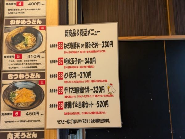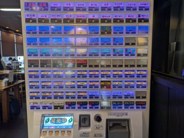 一番人気の「豚塩玉」(500円)を注文しようと思ったのですが、ある一声で、急遽気持ちが変わり「あったか出汁 きつねうどん」(450円)のボタンを押すことに。