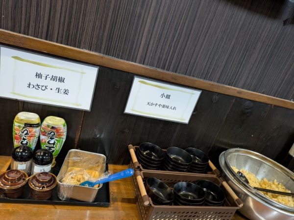 トレーをレーンに乗せて移動し、こちらの薬味&天かすコーナーでトッピングタイムです。