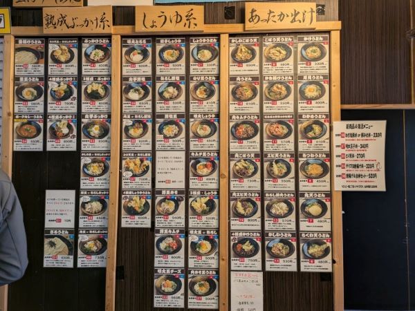 券売機の手前には、大きなメニュー表が壁に掲示されています。その数なんと約50種類!