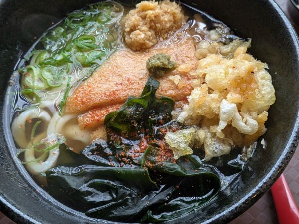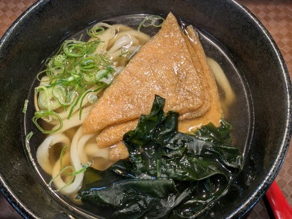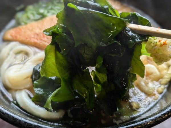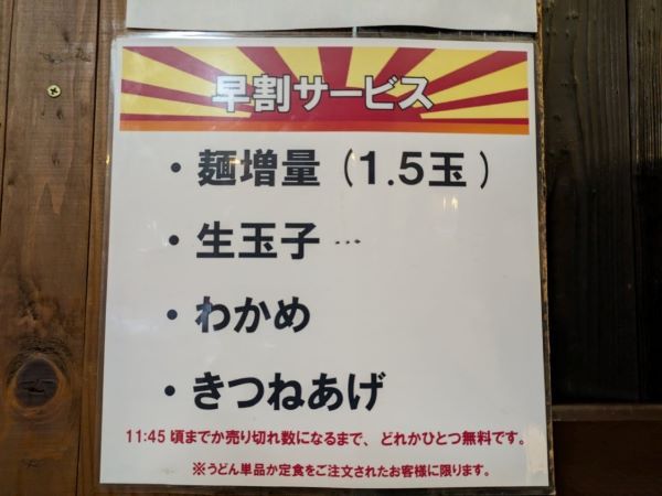 開店から11時45分頃まで(もしくはなくなり次第終了)、早割のサービスがあり、こちらから1つの特典を受けられます。実は直前で「きつねあげ終わりでーす」とスタッフの方の声が聞こえたので、急にきつねあげが食べたくなったのでありました・・・生玉子も終了だったので、わかめをサービスでいただくことにしました。早起きは・・・ならぬ、早来店は良いことがあるんですね~。