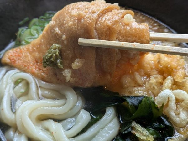 大ぶりのきつねあげは3枚も入っていて、しっかりと味が染みた甘い味付けは、スッキリめのスープと対照的なので、コントラストが楽しめて大満足!