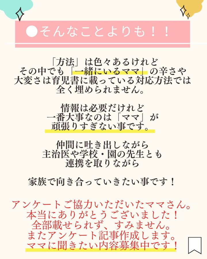 実際にアンケートを取る中で多くのママが「私も知りたい」「みんなどんな方法で対応しているのか知りたい」というお声もたくさん頂きました。やはり、みんな悩んでいるんですよね。