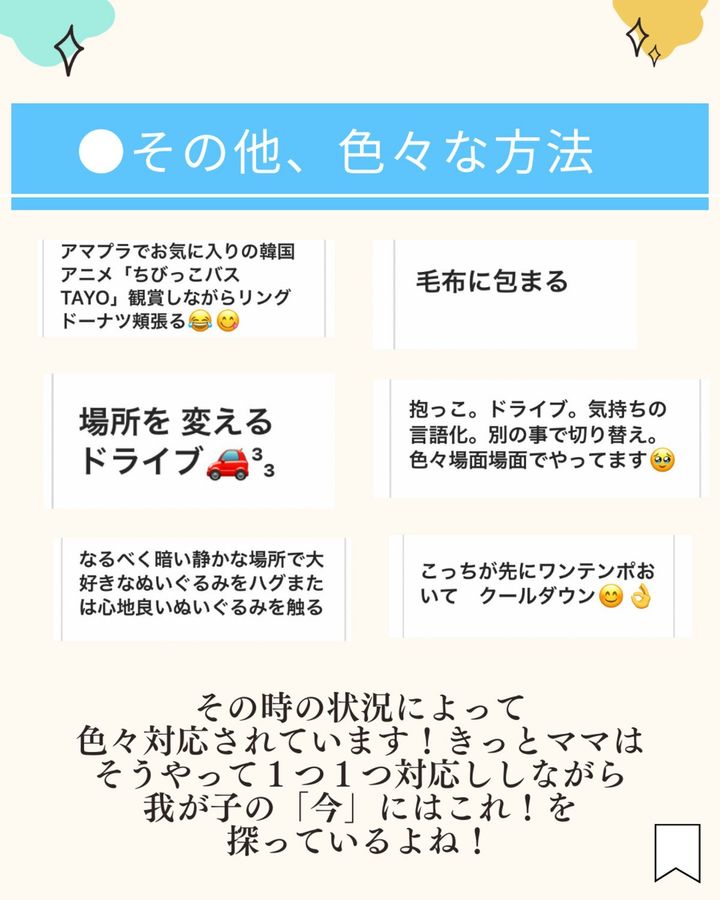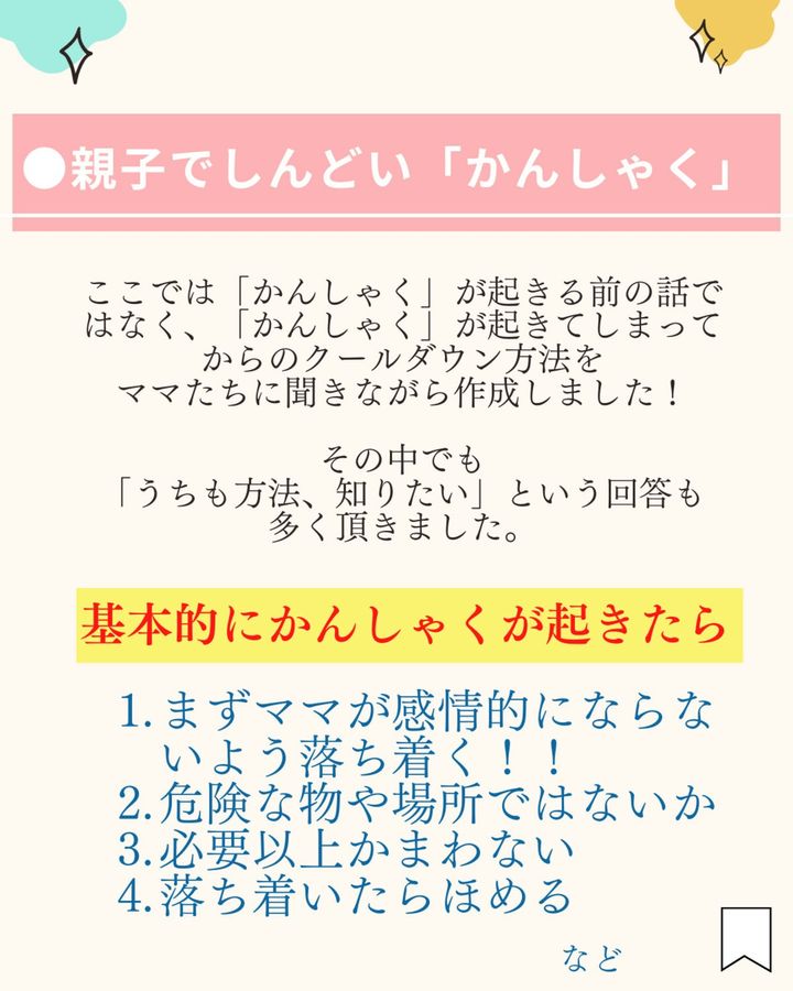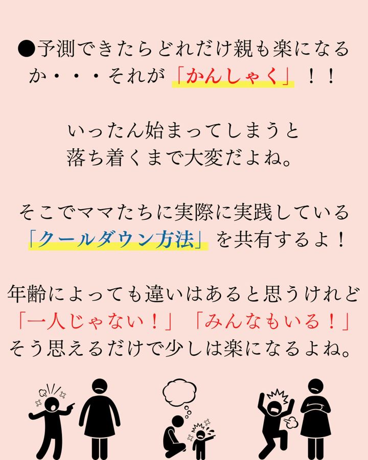 今回は子育て中のママたちに「わが子のクールダウン方法」を聞き、どんな方法でみんな対応しているのか、声を集めてみました。悩めるママたちに、そして子どもたちに1つでも何か良い方法があったらいいな、と思います。同じ悩みを持つ親同士、助け合っていきたいですよね。焦らずできることから、共に進んでいきましょう!