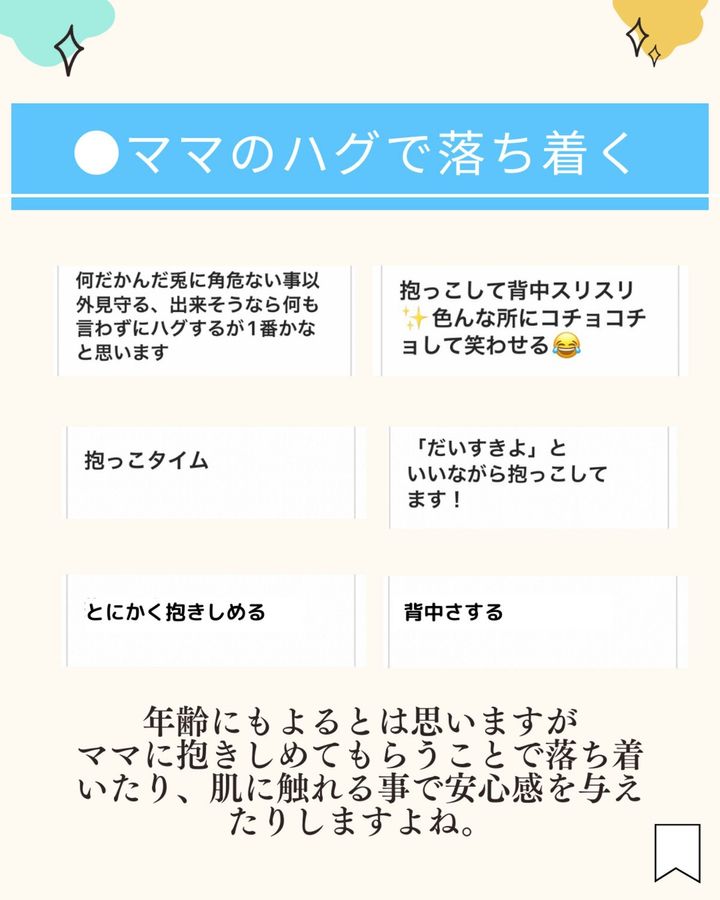 実際に「ママのハグ」で落ち着いている子も。ママのぬくもりが子どもの安心感につながります。そこからゆっくり気持ちに寄り添っていきながら、好ましい対応方法を時間をかけて伝えていけたらいいですよね。