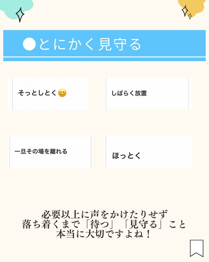 そこから「見守る」「その場を離れる」など危険のないように対応をしていきながら、ゆっくり本人なりの「クールダウン方法」が見つかっていったらいいなと思います。