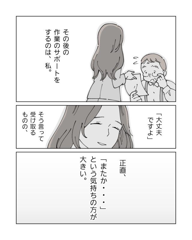 そして、「その後の作業のサポートをするのは、私」と心の中で呟く亜美さん、「大丈夫ですよ」そう言って受け止めるものの、正直、「またか・・」という気持ちの方が大きいと感じていました。
