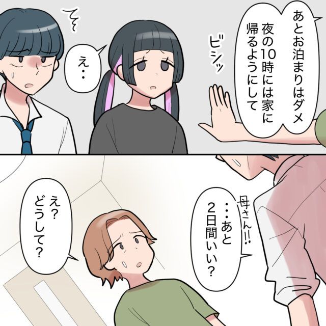 そして、「あとお泊まりはダメ。夜の10時には家に帰るようにして」とビシッと伝えました。すると「え・・」突然顔色が暗くなるエリカさん、それに気づいたミズキくんが「母さん!!・・あと2日間いい?」突然お母さんに言い、「え?どうして?」お母さんは怪訝そうな顔をしました。
