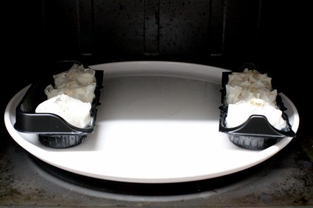 1. ターンテーブルの端にシュウマイのトレーを置き、ラップをかけずに電子レンジ(600W)で約3分10秒温めて半分に切ります。