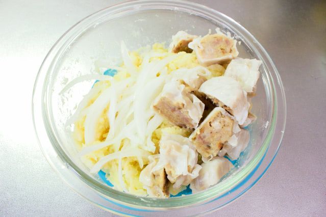 水気をしっかり切った玉ねぎとシュウマイを混ぜ合わせます。シュウマイがゴロゴロ入っているので、ポテトサラダというよりも、シュウマイのじゃがいも和えといった印象です。