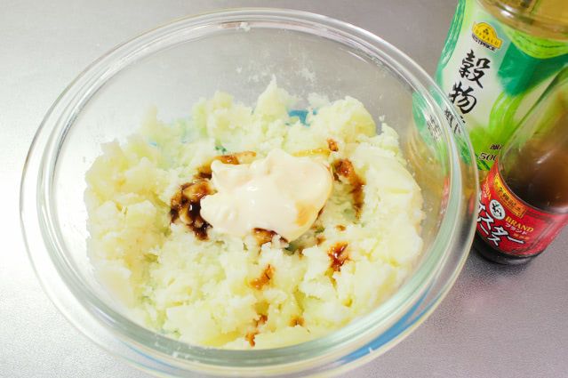 4. じゃがいもが熱いうちに潰し、オイスターソース、酢、マヨネーズを加えて混ぜます。