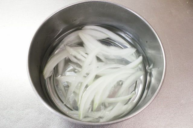 2. 玉ねぎを薄切りにし、水に3分晒して水気を切ります。