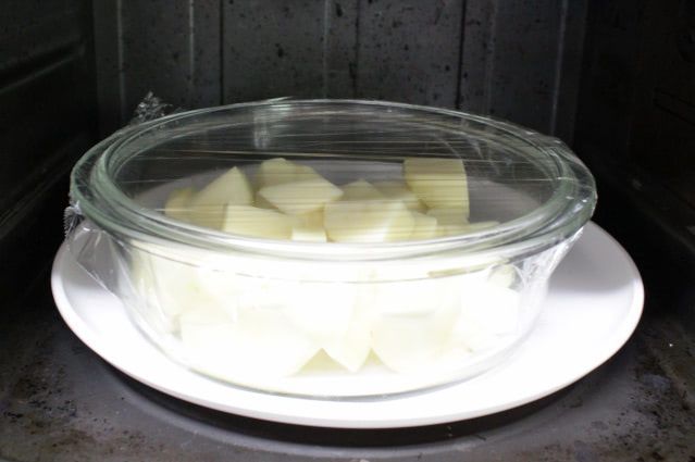 今回は大サイズのじゃがいもを使ったので、しっかりと火が入るように電子レンジ(600W)で6分30秒加熱しました。