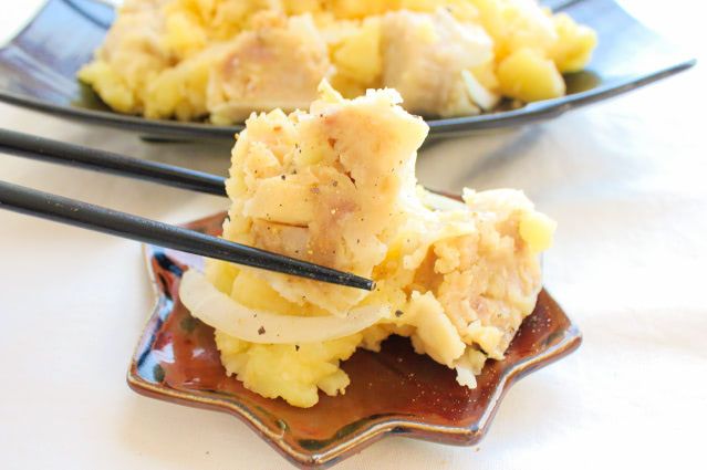今回は普段のポテトサラダを作る感覚で、じゃがいもの粒が少し残るように潰しましたが、ごろっとしたシュウマイが特徴のこのポテトサラダに限っては、じゃがいもをシュウマイくらいの大きさに揃えるか、ペースト状にしてシュウマイにまとわせるかのどちらかにした方がいい気がしました。