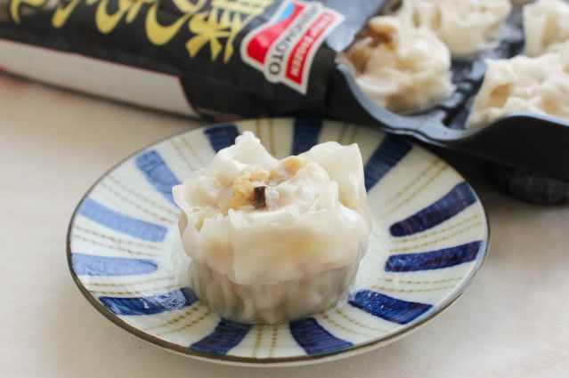 「やみつきシュウマイポテサラ」を作る前に、レンジで温めた「ザ★®シュウマイ」を味見してみます♪大ぶりなシュウマイなので食べ応えがありそう。