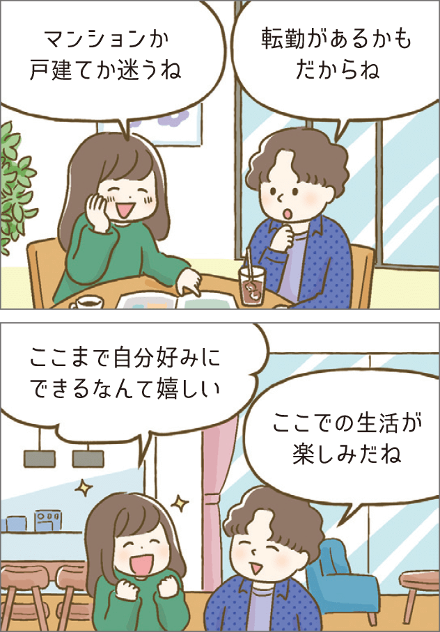 私は戸建て希望で、夫はマンション希望。どちらにするか決められず、まずは住宅展示場、モデルルームを見てまわりました。転勤の可能性があるので、最終的にはマンションにすることにしました。