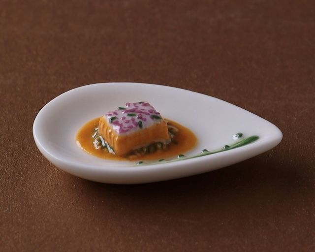 ちょっと個性的なフェーブは、店舗メニューの「北海道産エイ 梅干しで酸味を効かせたブールノワゼットと共に」をモチーフとしたものです。