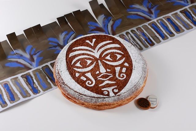 「JEAN-PAUL HÉVIN」(ジャン=ポール・エヴァン)からは、『LES NOUVEAUX MONDES (新しい世界)』をイメージした「ガレット デ ロワ アフリケン」が登場です。粉糖で描かれた顔がインパクトのあるデザイン。カカオの採れる大地の先住民族をイメージしたフェーブと王冠もついてきます。