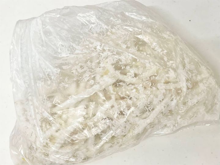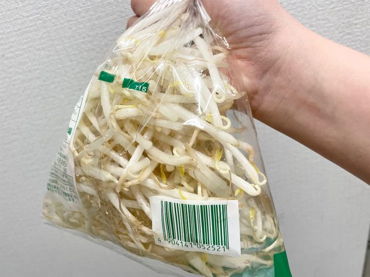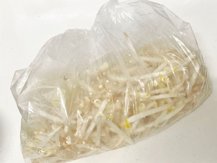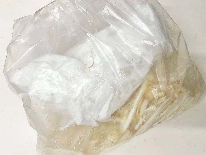 2. ポリ袋にもやしとキッチンタオルを入れて振り、水気を拭き取ります。